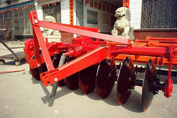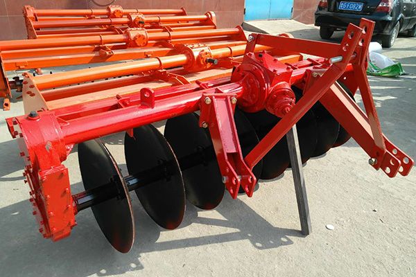 驅(qū)動圓盤犁采用拖拉機后三點懸掛機構(gòu)進行掛接,機具在工作過程中通過拖拉機后動力輸出軸(PTO)將動力傳遞到圓盤犁齒輪箱中,來驅(qū)動圓盤犁進行旋轉(zhuǎn)。該驅(qū)動圓盤犁主要適用于水田耕作,具有不纏草,作業(yè)質(zhì)量高,工作效率高的特點。